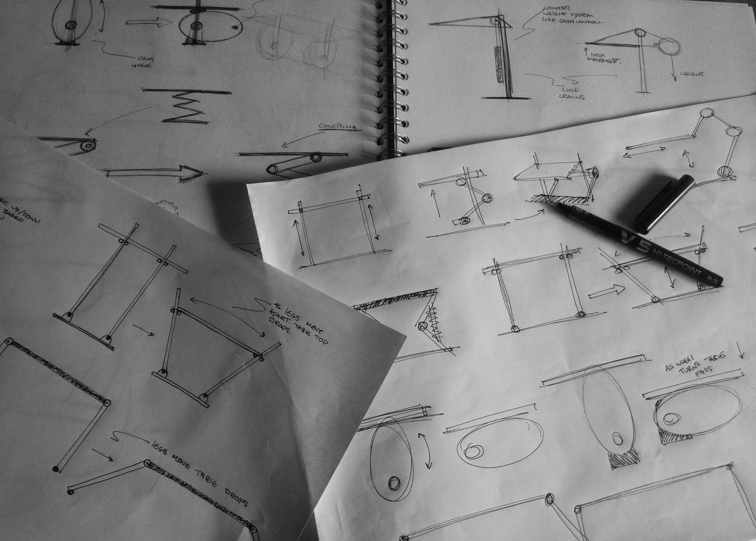 After completing a range of concept sketches of mechanisms I decided on a 3 limbed "angle poise" style that pivots on a base. This design allows the desk to be extremely flexible in its layout. Not only can the height of the work surface be drastically adjusted but the entire structure can be folded down for space saving either in use or more importantly during transport, greatly improving the carbon footprint produced during the distribution of the product.
